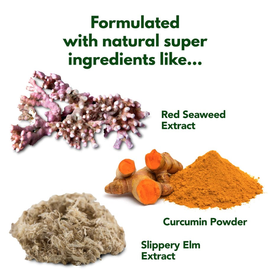 Ingredients: Red Seaweed Extract, Curcumin Powder, Digestive Enzymes, Glutamine & Threonine, Mycotoxin Binder, Slippery Elm Extract, Aniseed Oil, Prebiotic and Probiotic.