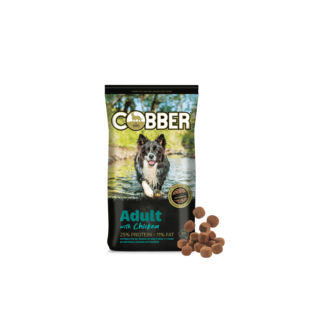 Cobber® Adult with Chicken is a complete and balanced adult dog food, formulated to meet the nutritional standards established by the Association of American Feed Control Officials (AAFCO) for maintenance of adult dogs.